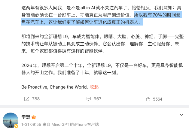 昨日李想再次在社交媒体撰调具身智能机器人的重要性。他表示,理想汽车虽然目前在战略上“all in AI”,但这并不意味着其不关注汽车本身。