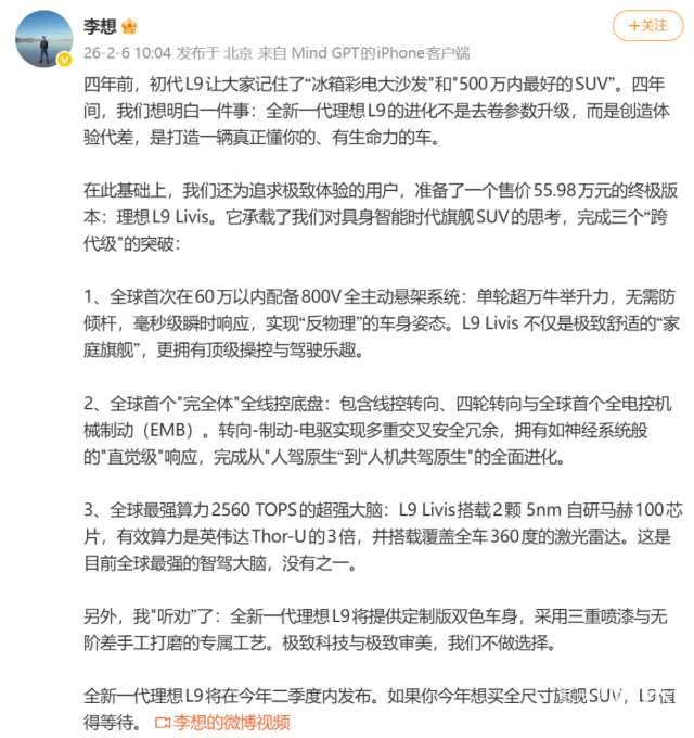于是乎,赶在春节之前,新一代理想L9正式官宣了!李想直接将新车定义为“具身智能机器人的开山之作”,为此理想准备了十年。